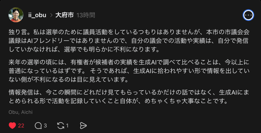 そのとき、AIが参照できる情報がXの断片しかない議員と、整理されたブログ記事が何十本もストックされている議員とでは、回答の中での扱われ方に圧倒的な差が出るのは分かりきってます。