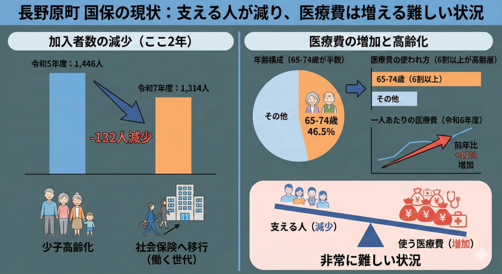 会議で示されたデータから、長野原町の国保の「今」と、これから始まる「新しい負担」について、ポイントを絞って分かりやすく解説します。